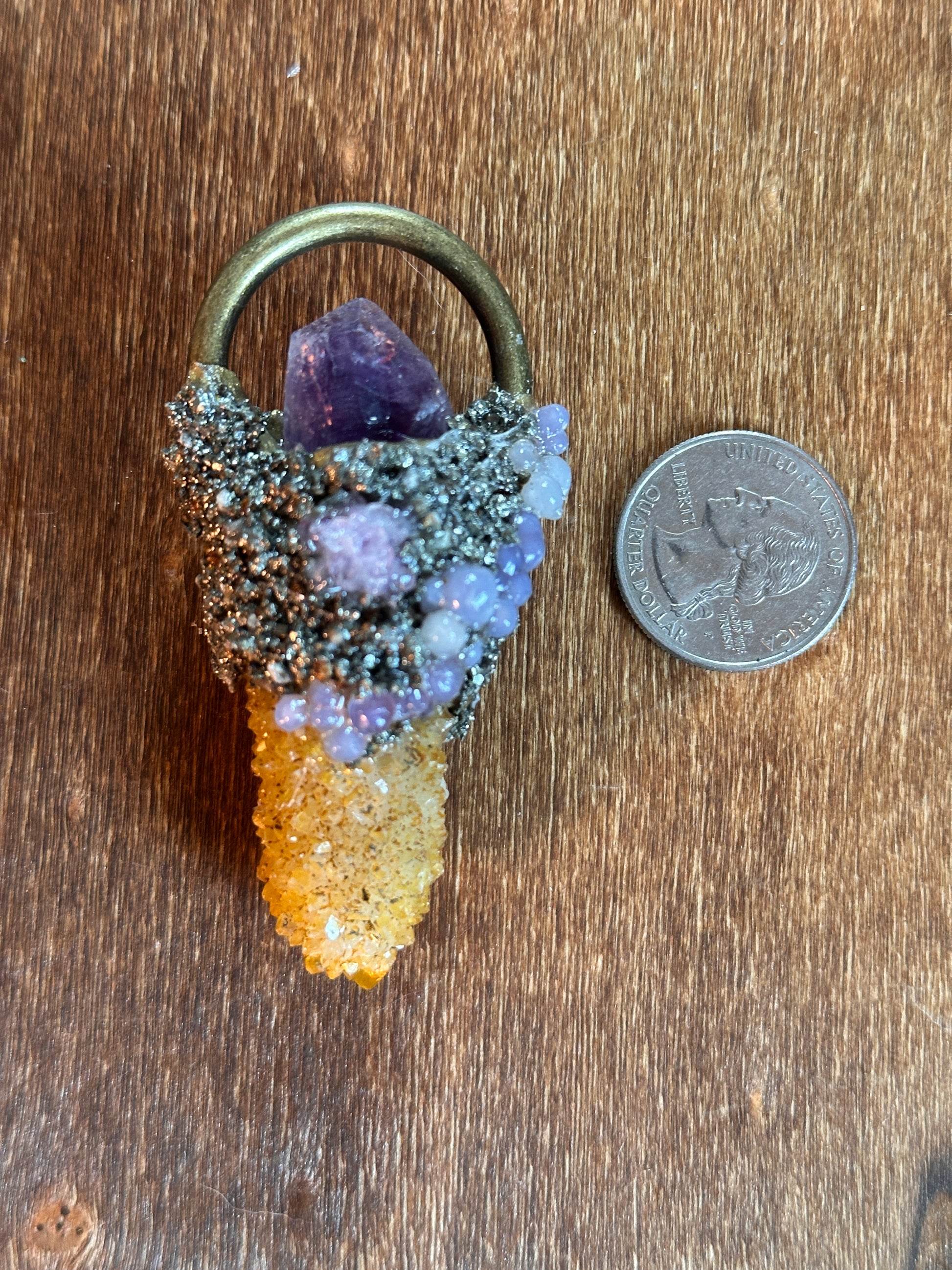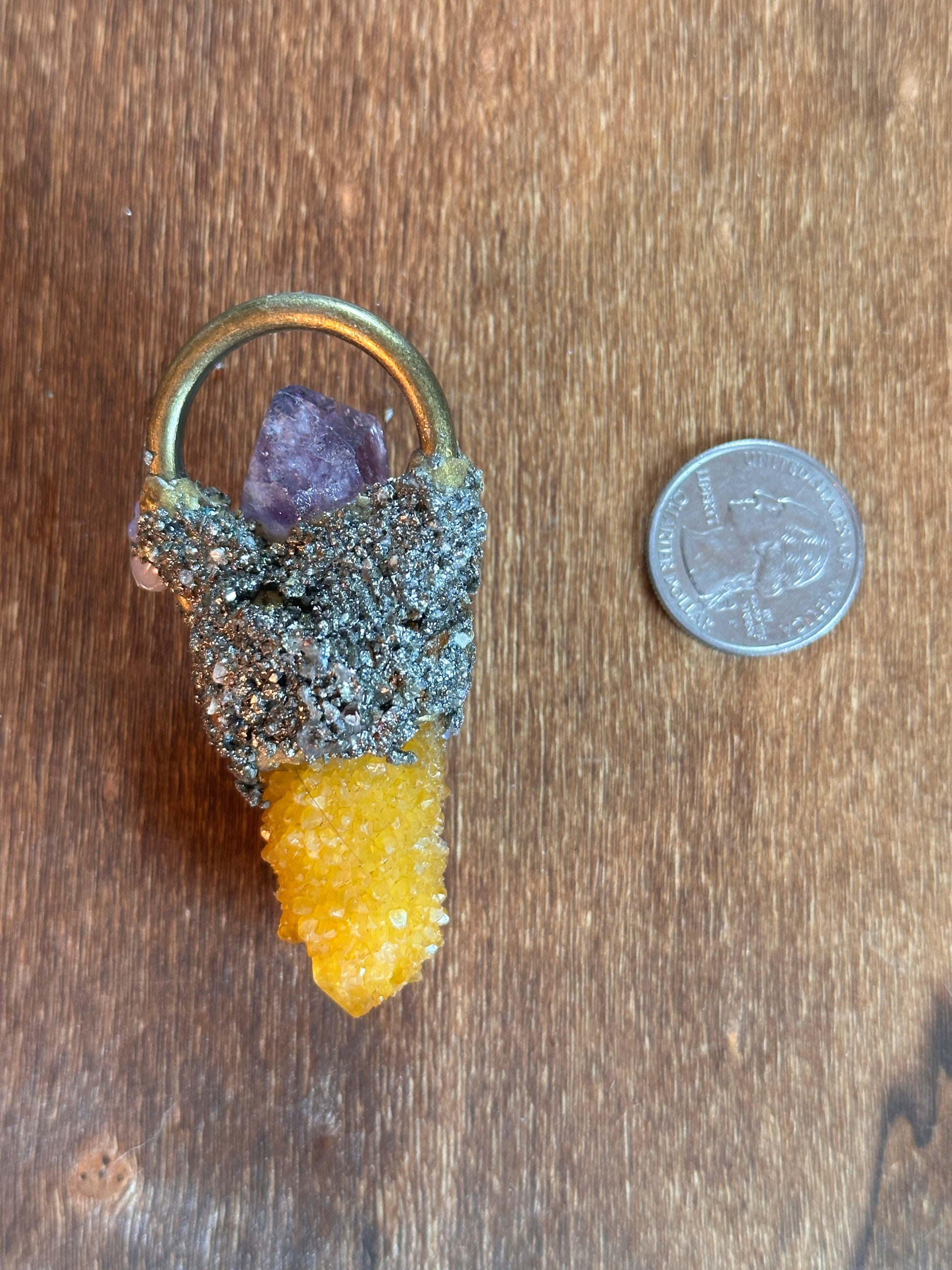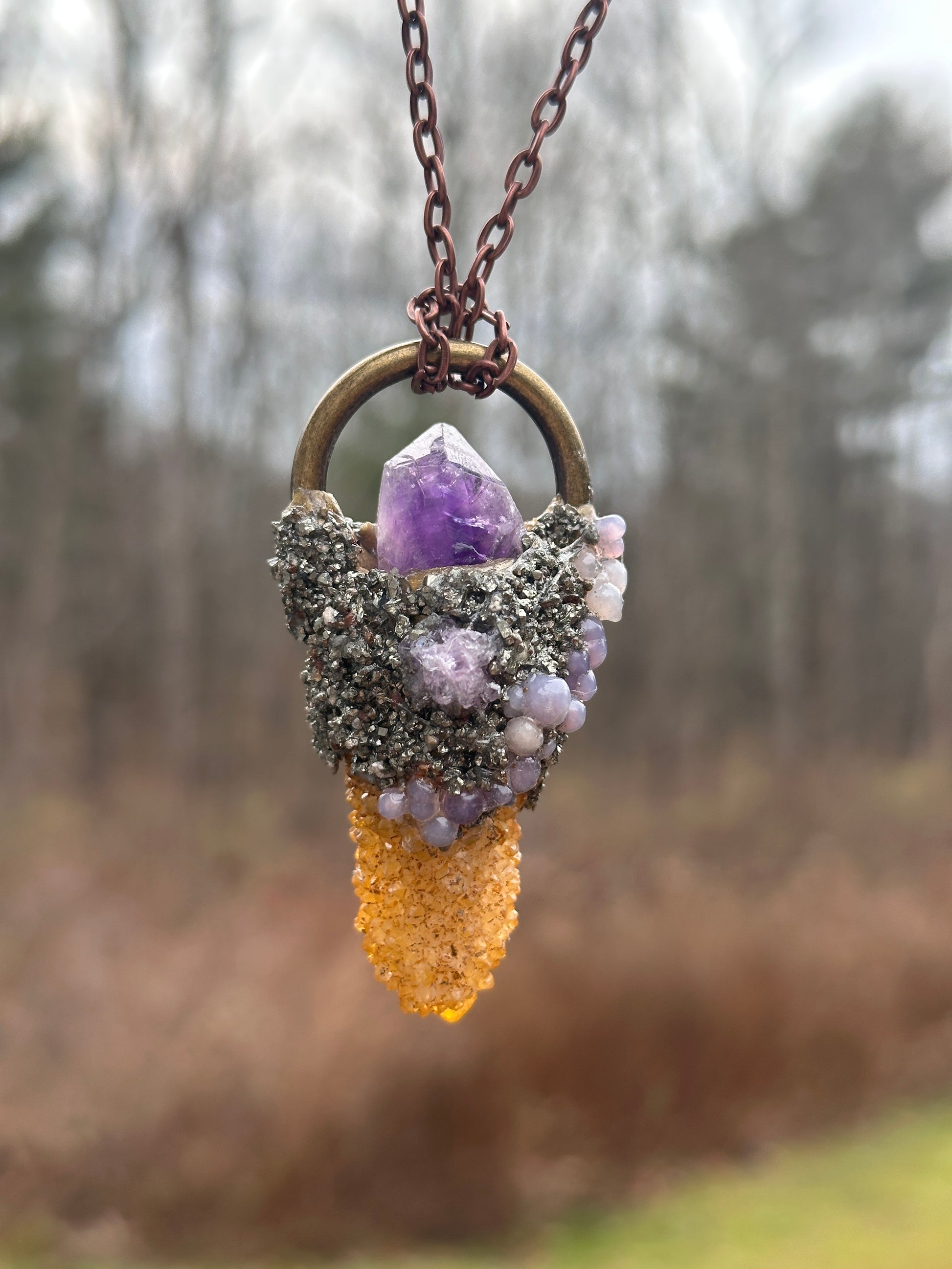 This one of a kind August Sunset necklace features a stunning golden healer spirit quartz paired with amethyst, grape agate baubles, and pyrite. This beautiful pendant captures the colors and vibes of an August sunset to carry with you year round!