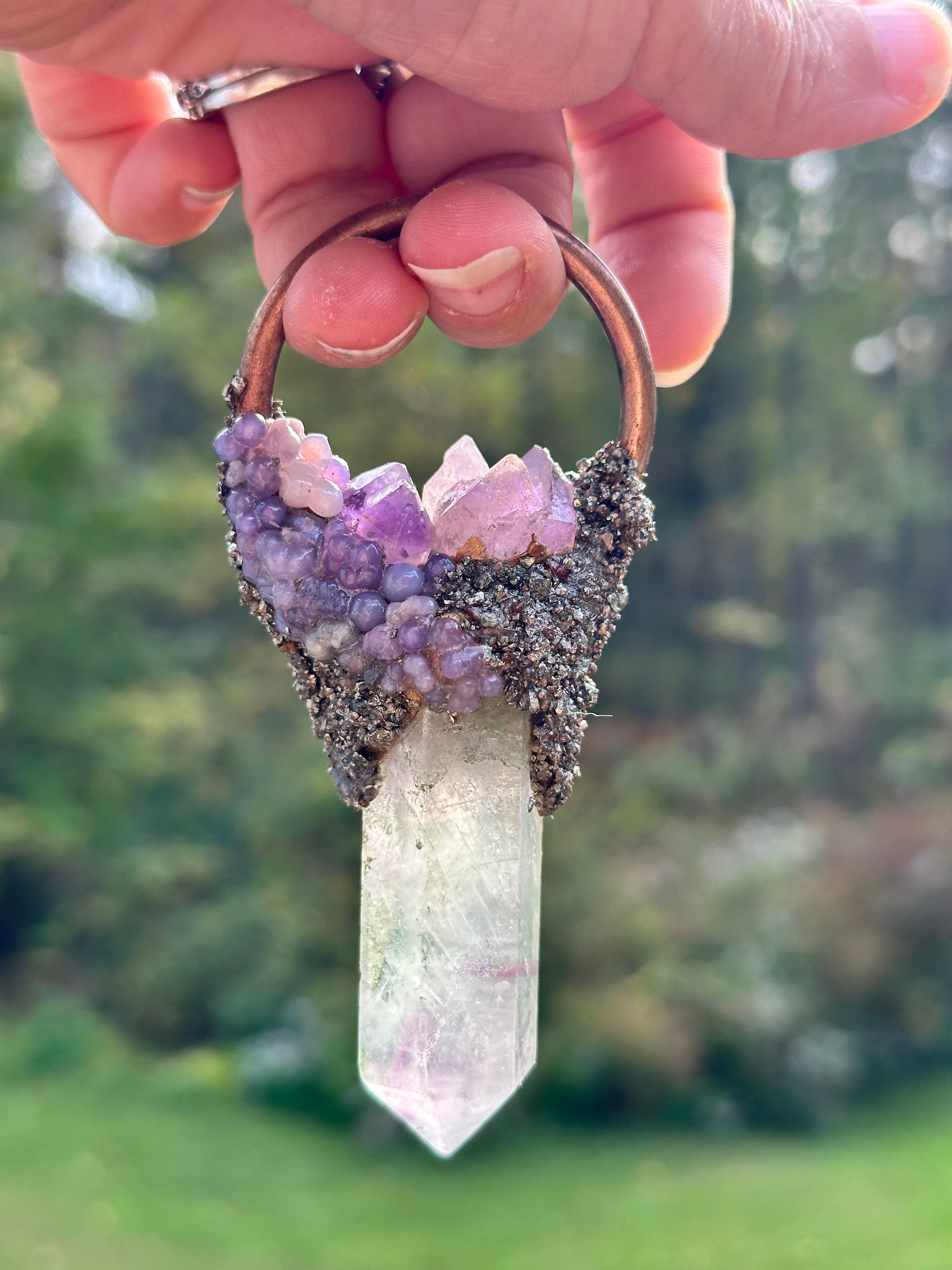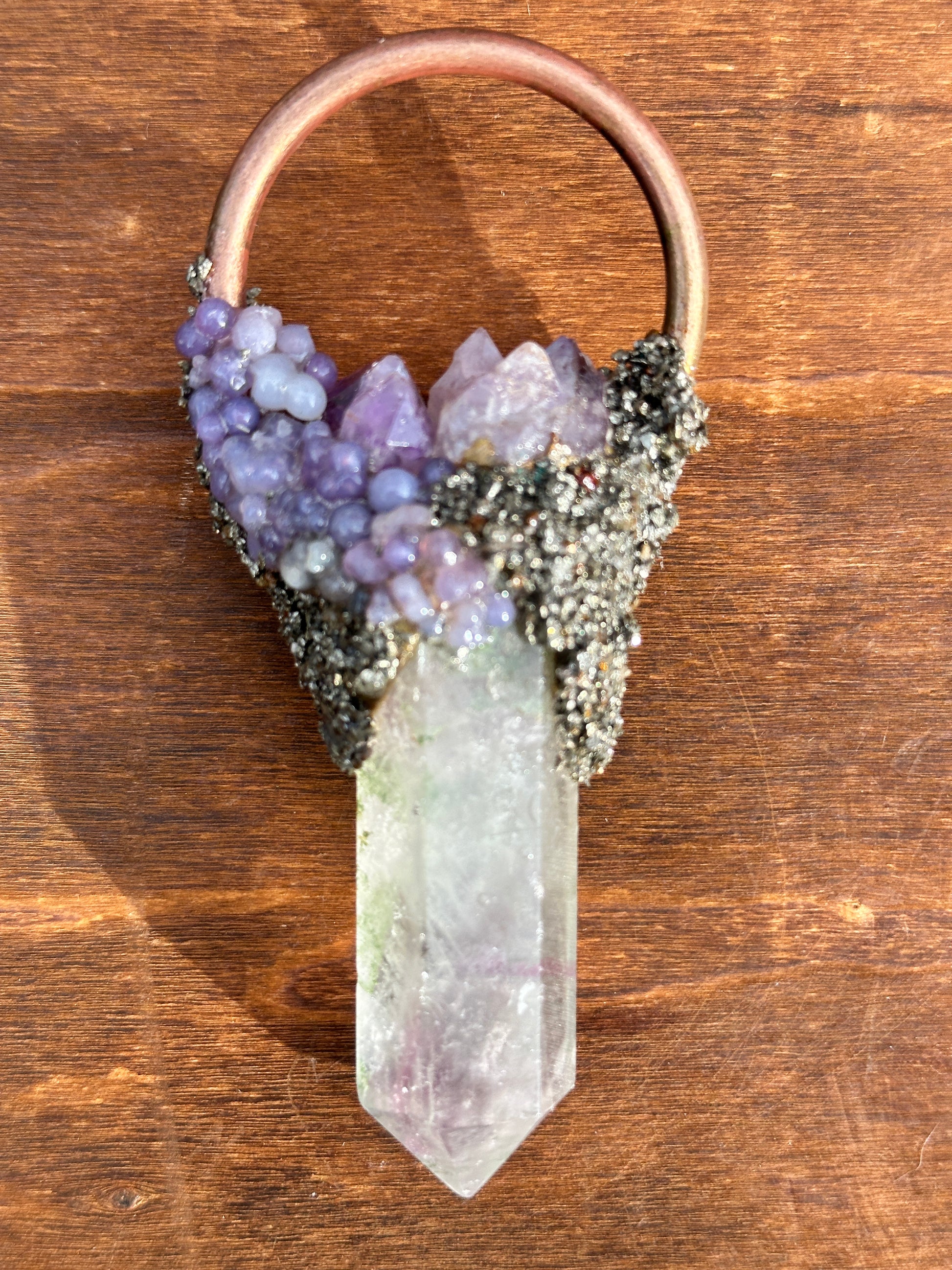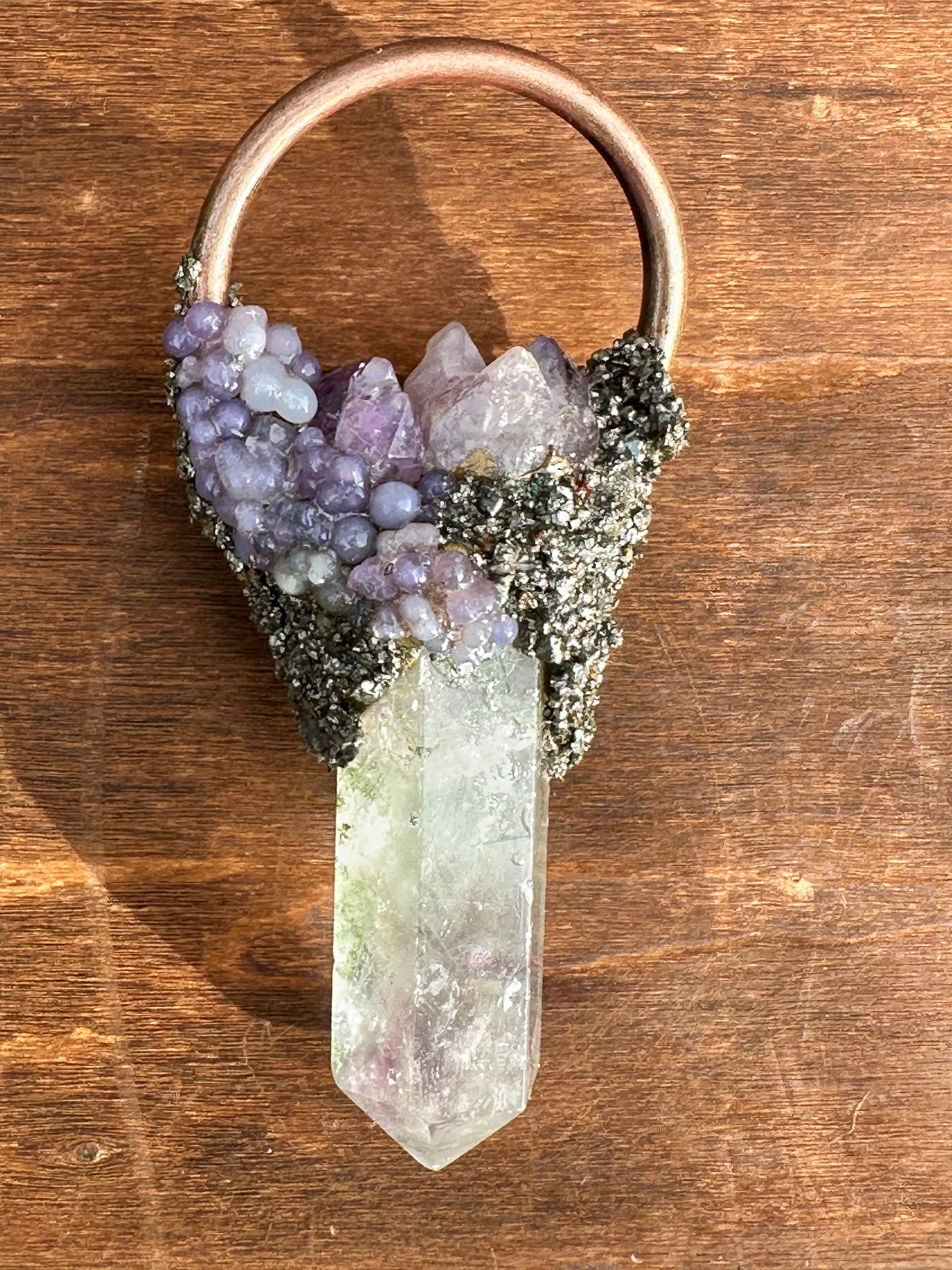 Fluorite, grape agate, amethyst and pyrite combine on this one-of-a-kind pendant!