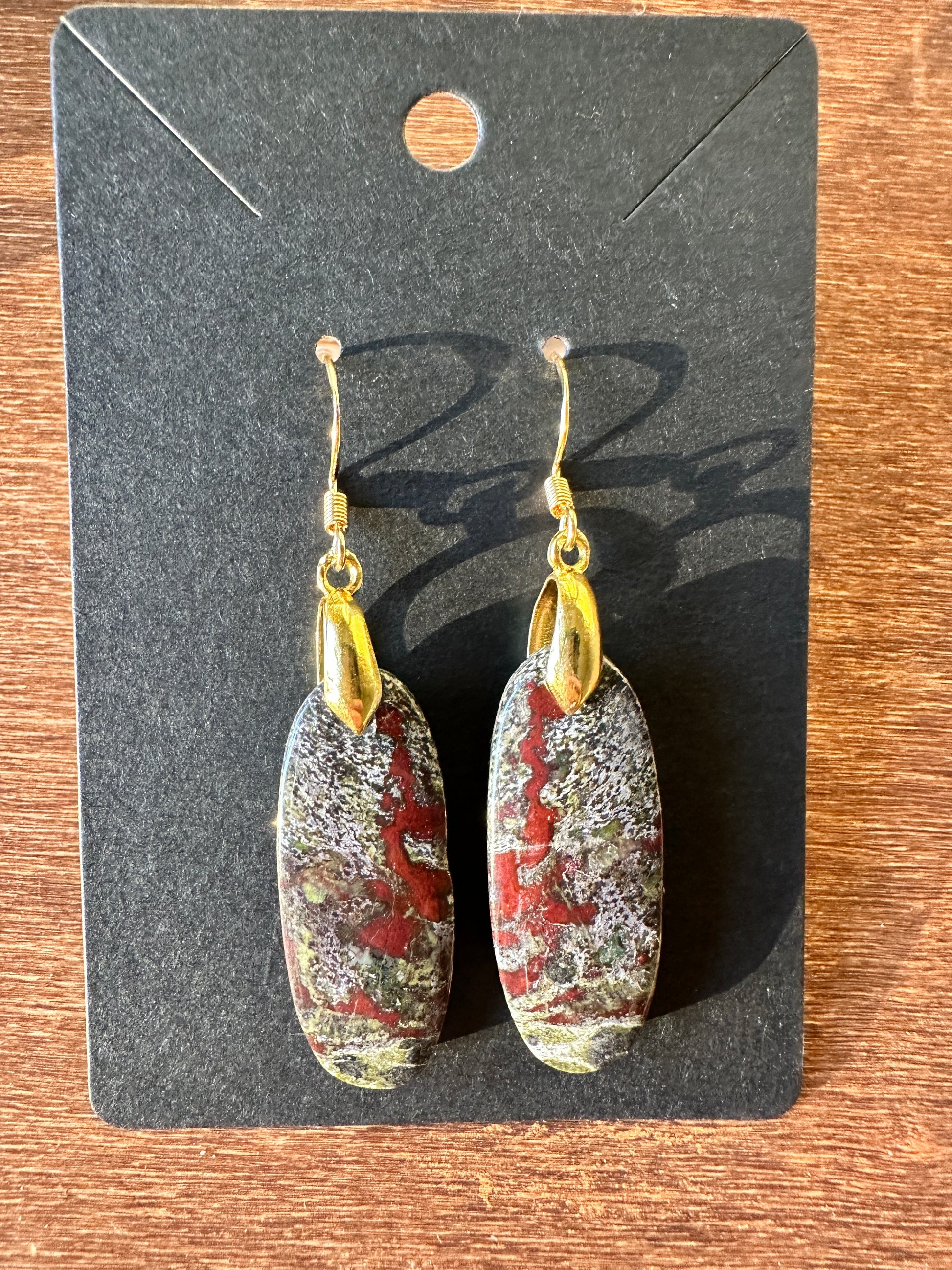 These long oval beauties feature unique dragon's blood jasper stones and elegant gold toned findings.