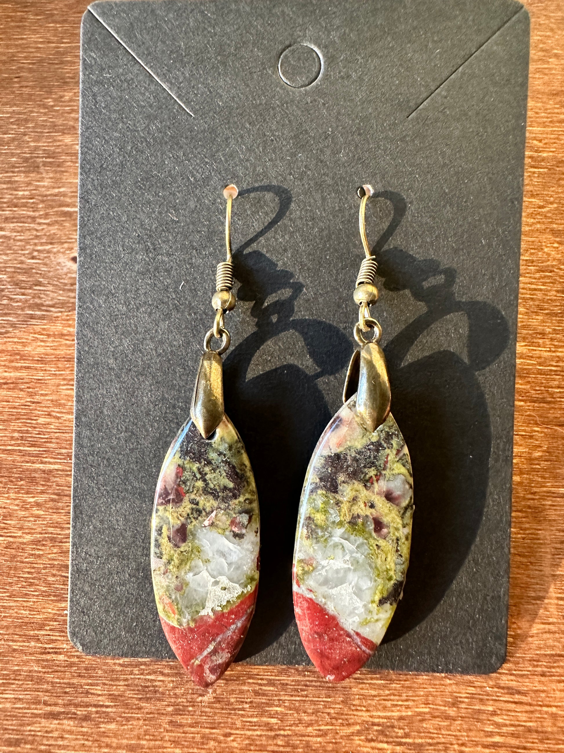 These pointed oval-shaped earrings featuring stunning Dragons Blood Jasper stones. The antique brass findings add a unique touch of vintage charm. Feel confident and stylish with these one-of-a-kind earrings.