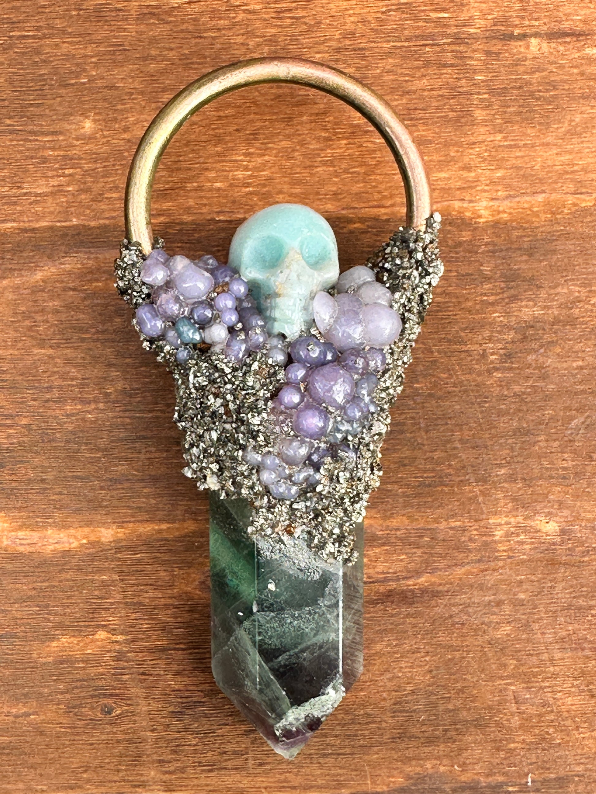 This one-of-a-kind pendant combines properties of Fluorite, amplifying intuition and mental clarity; grape agate, promoting inner strength and peace; and pyrite, attracting abundance and positive energy.
