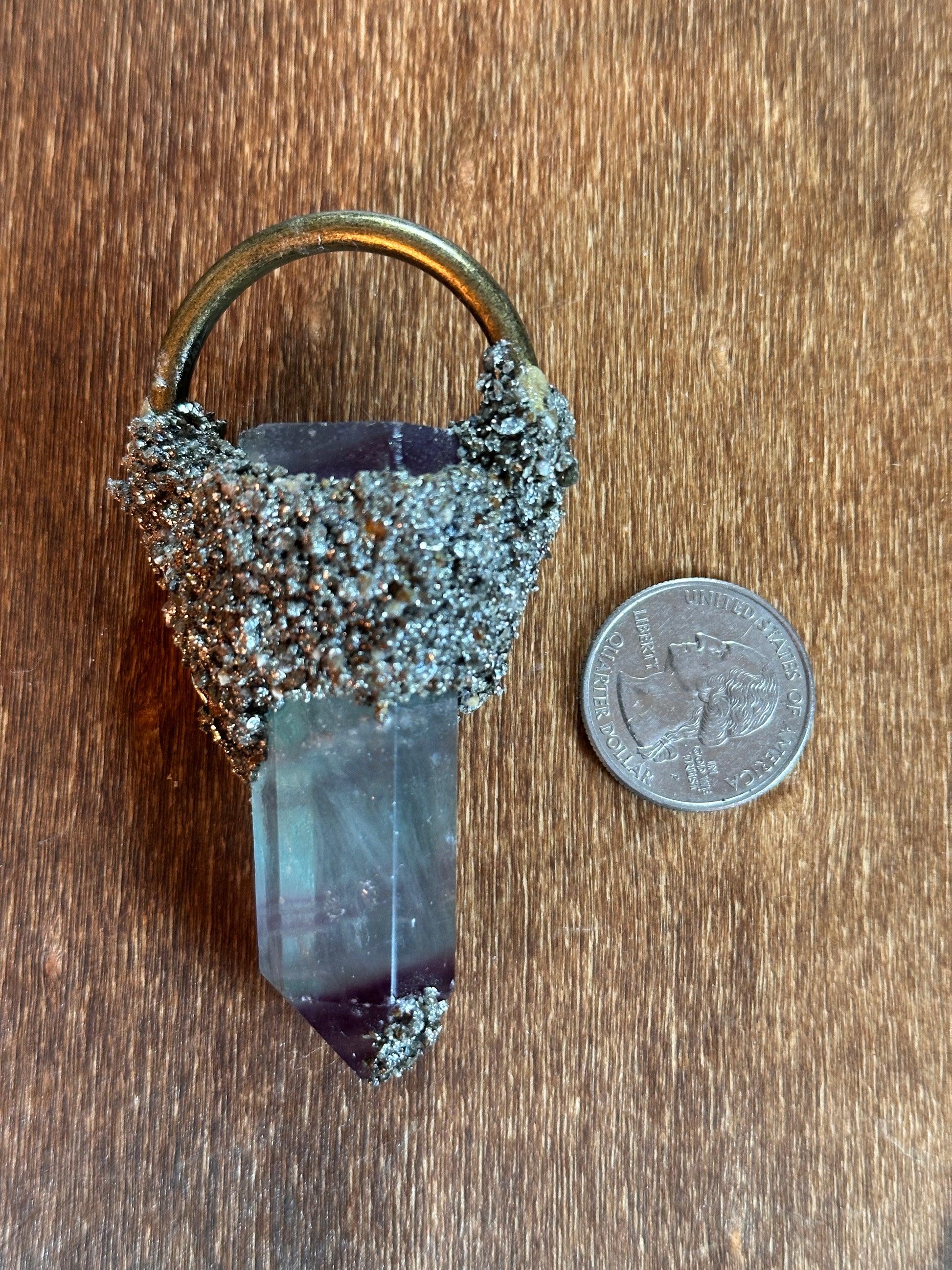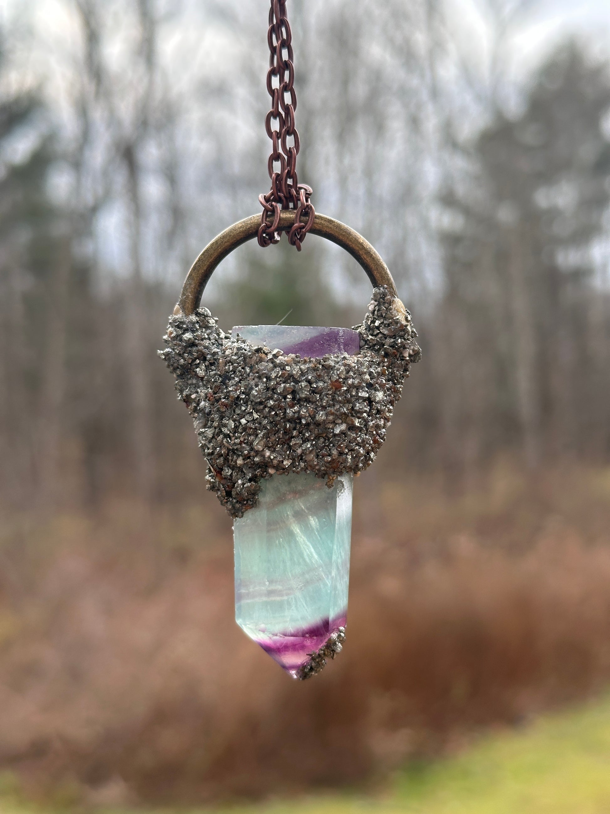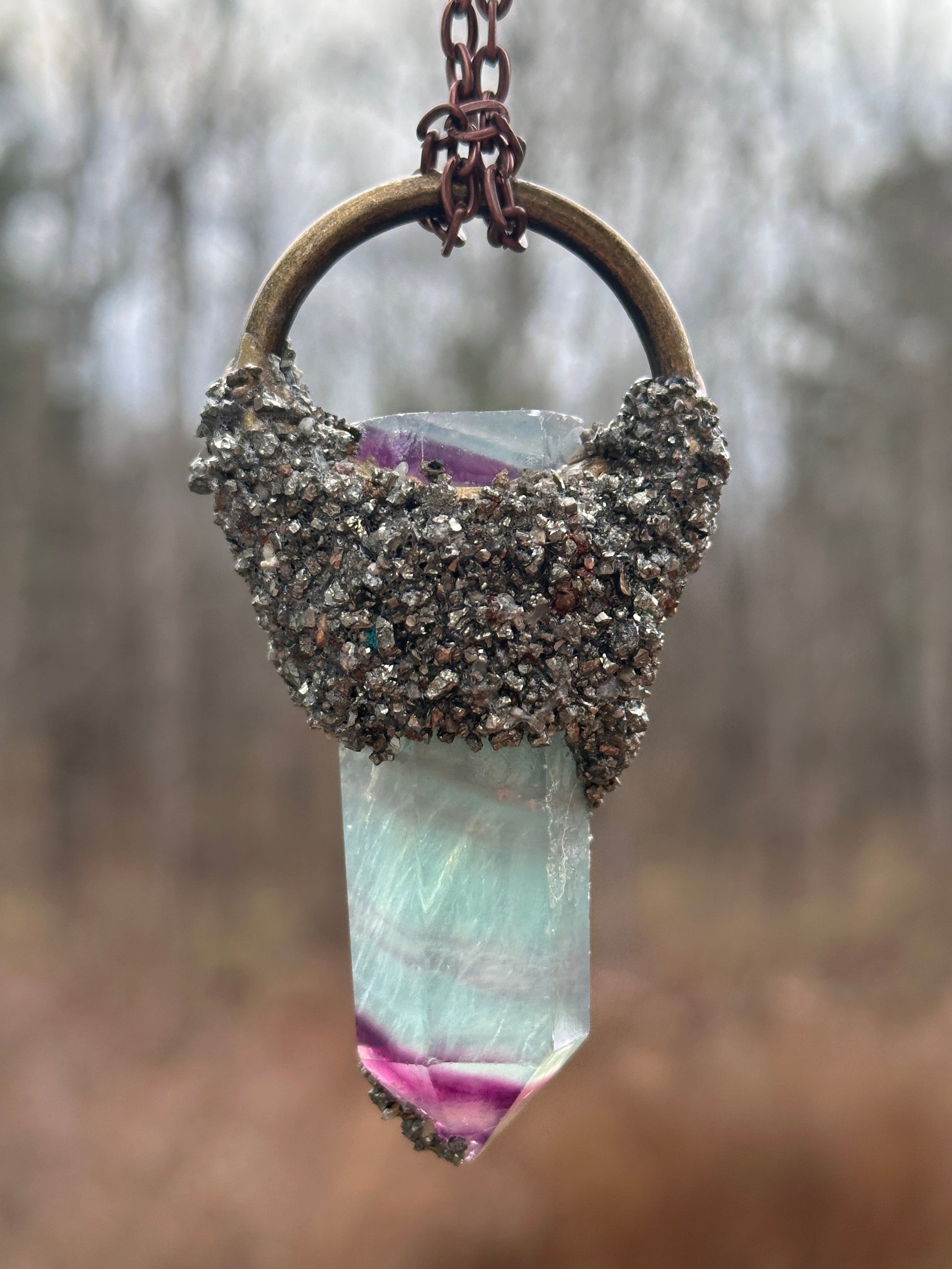 A “jolly rancher-esque” fluorite pairs with pyrite crystals for this pendant.