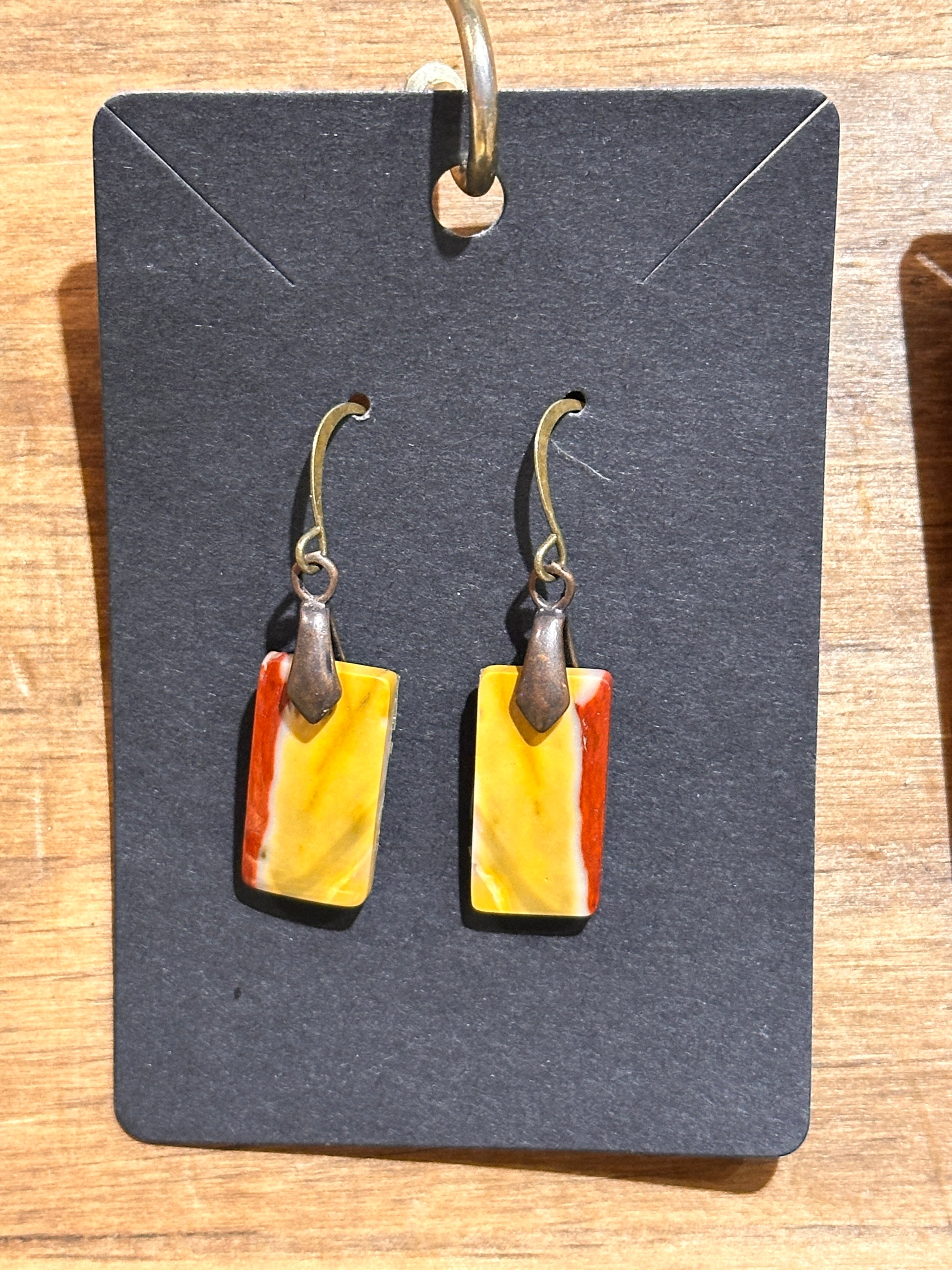 Rectangular cut mookaite gemstones with antique bronze ear wires.