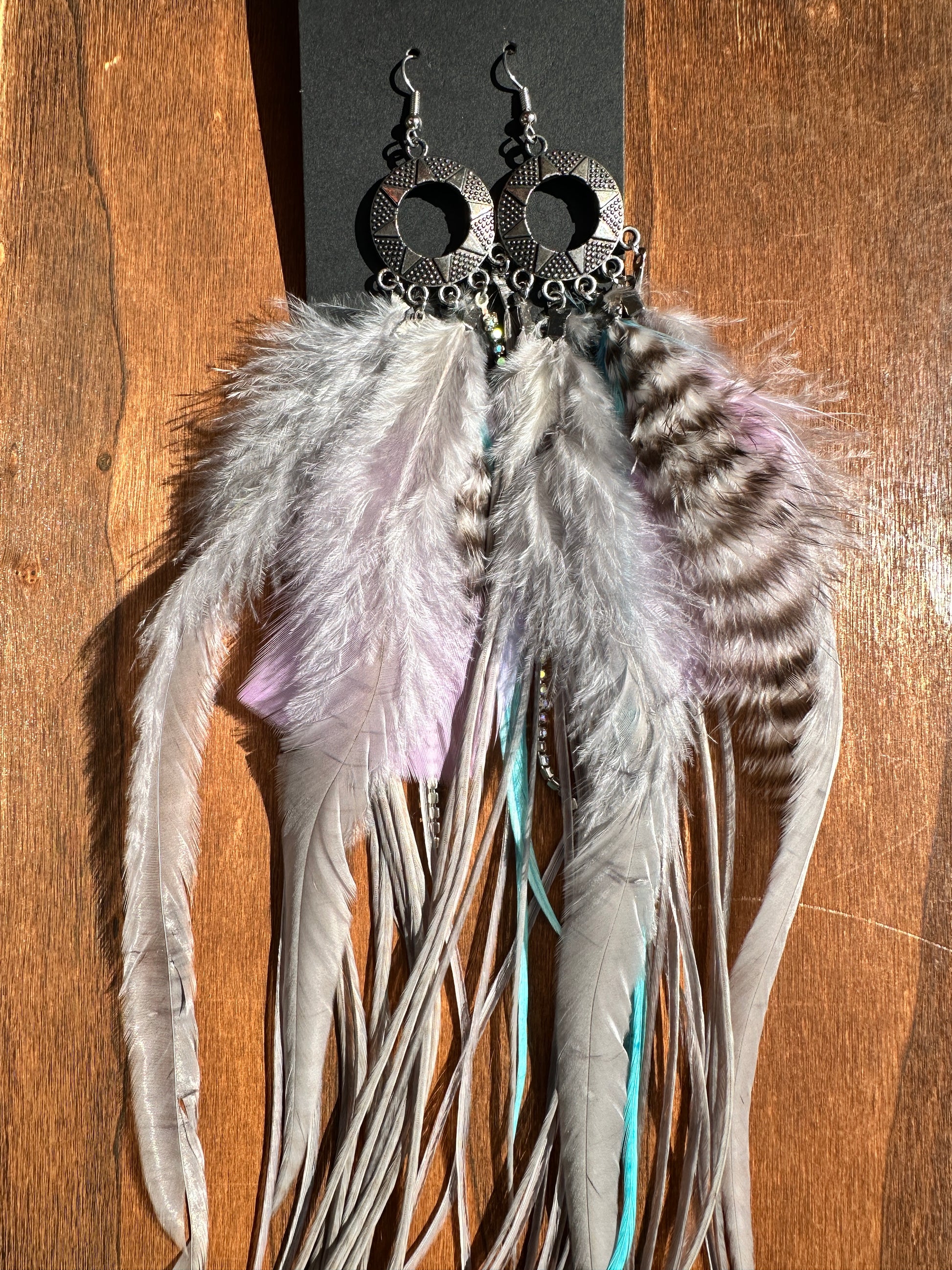 Pastels are the perfect accessory for adding a touch of delicate color to any outfit. These feather earrings feature a beautiful mix of light blue, and lavender, and gray, providing a subtle and elegant look.