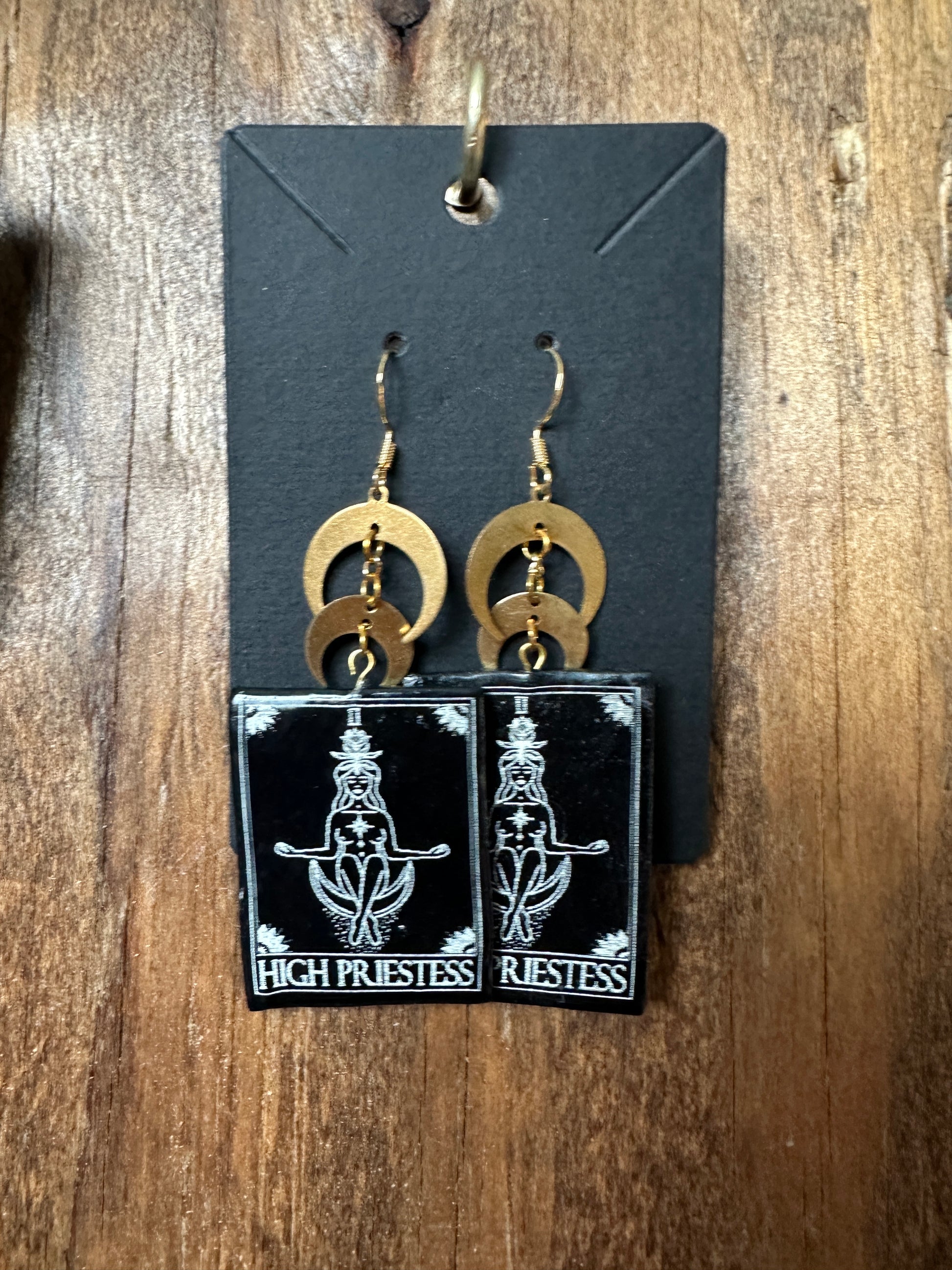 Introducing Tarot: High Priestess, the must-have earrings for any tarot enthusiast. These elegant earrings feature tarot cards with double gold tone moons, suspended from 18k gold plated ear wires (other options of ear wires available).