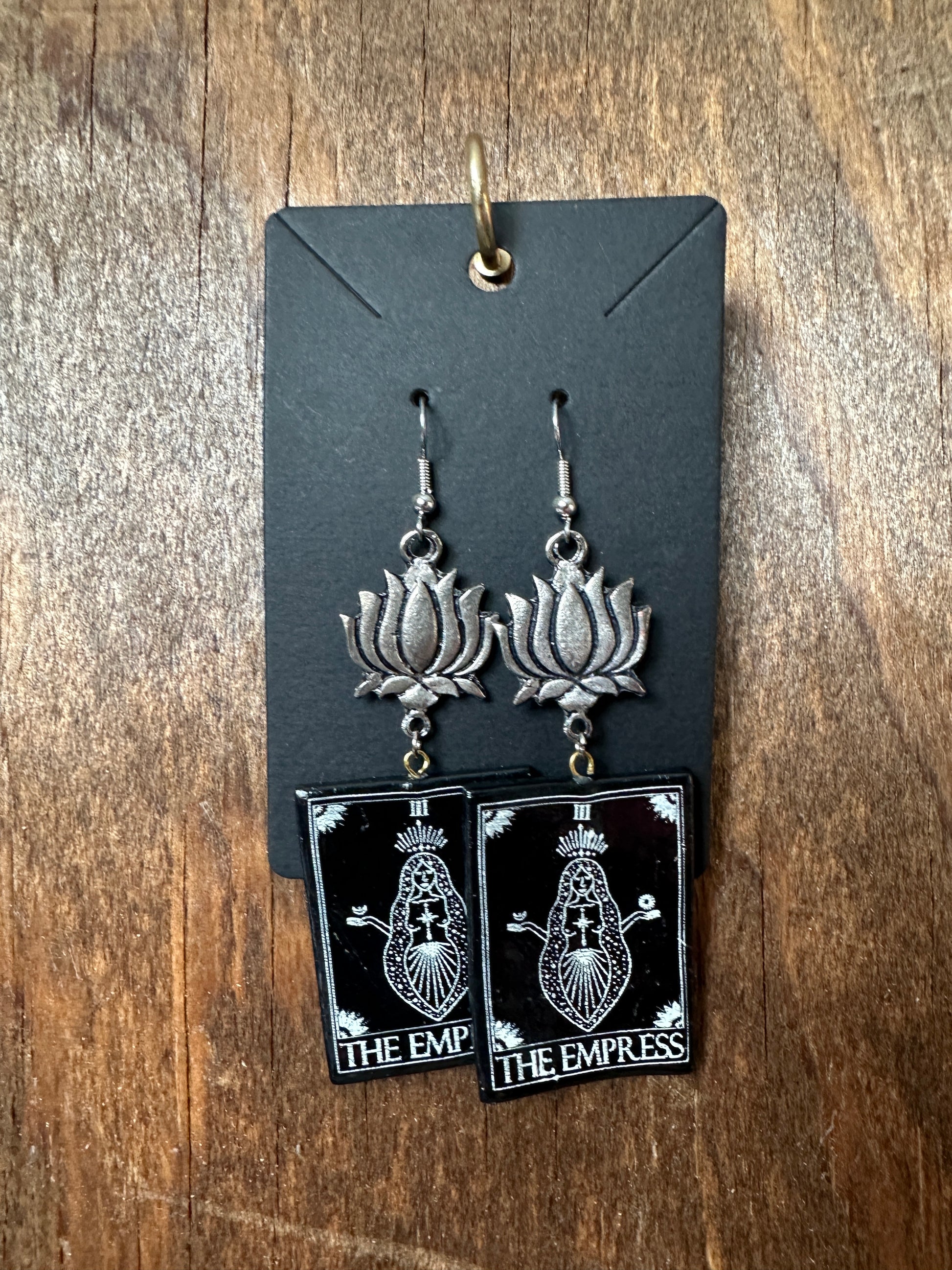 Upgrade your accessory game with these Tarot card earrings featuring the Empress and a delicate lotus flower design. Made with hypoallergenic steel ear wires, these earrings are perfect for everyday wear. Embrace your inner empress and add a touch of mysticism to your style.