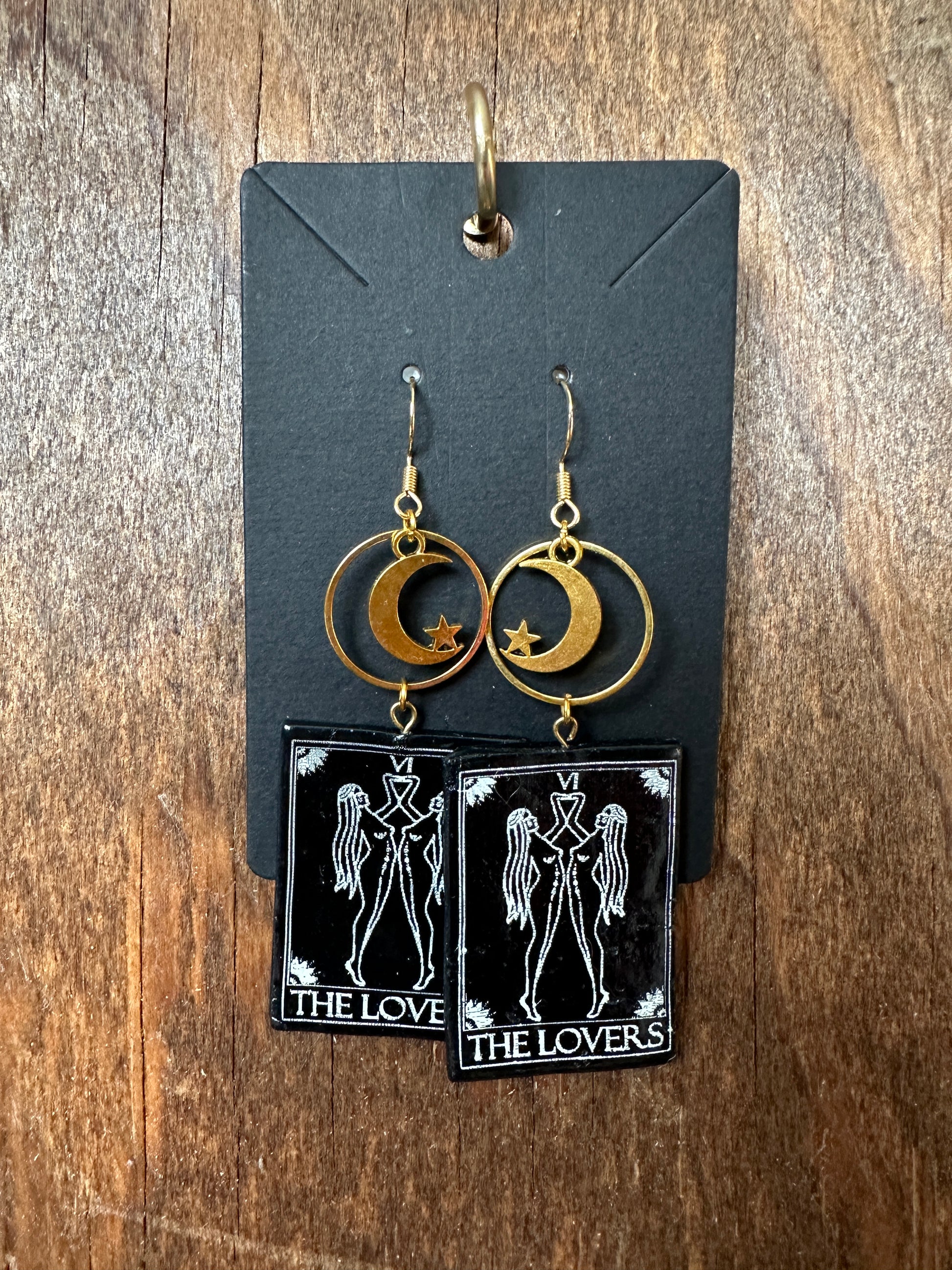 Tarot inspired earrings with gold tones moons & circles. They feature 18k gold plated ear wires (that can be switched for any style you prefer!).