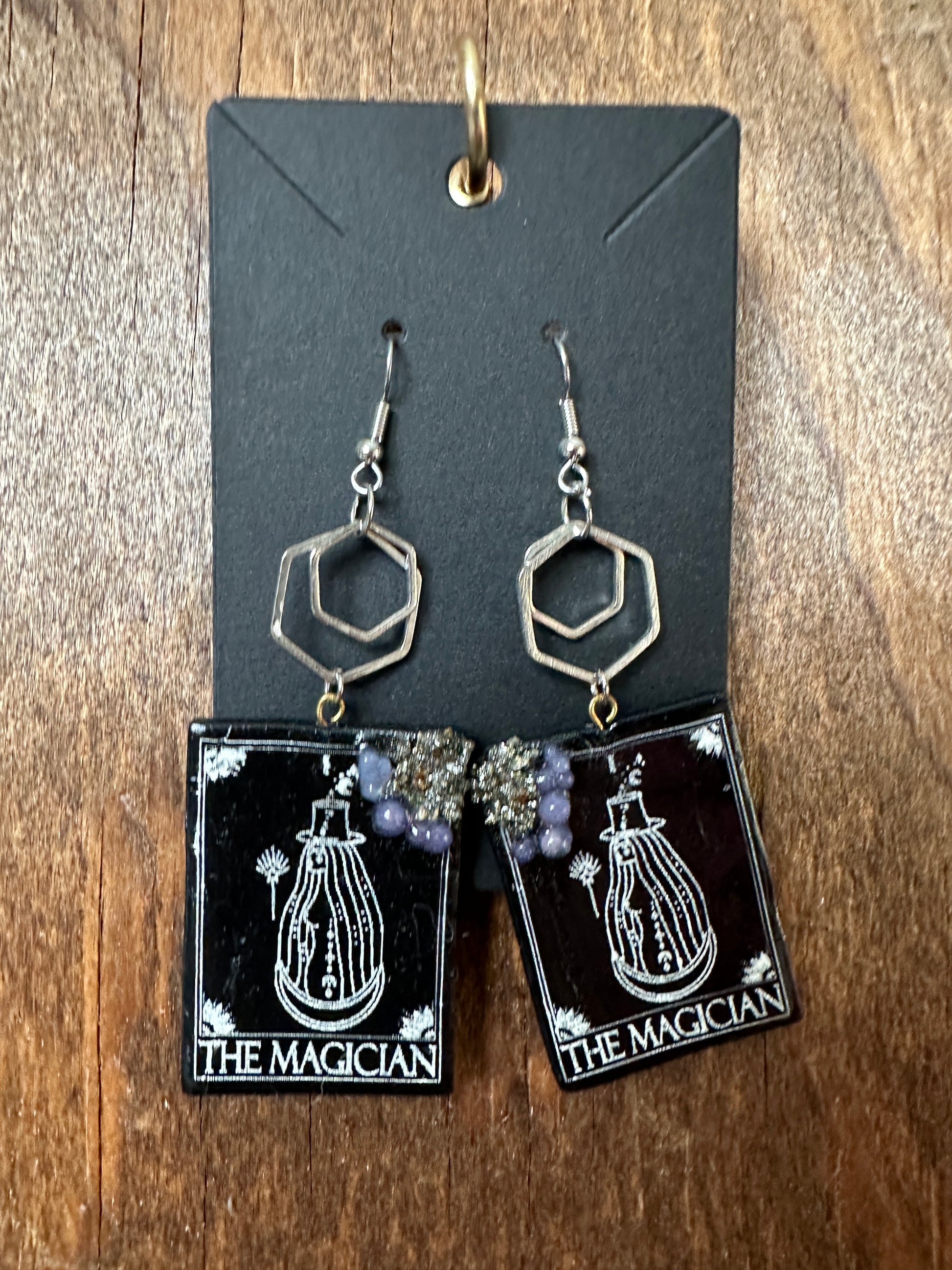 Elevate your style with our Tarot: The Magician earrings. Made with real grape agate and pyrite, these stunning earrings feature the iconic Tarot card, the Magician. Channel your inner magic and confidence with these unique and charming accessories. Perfect for any occasion. They have hypoallergenic steel ear wires (which can be switched for any style).
