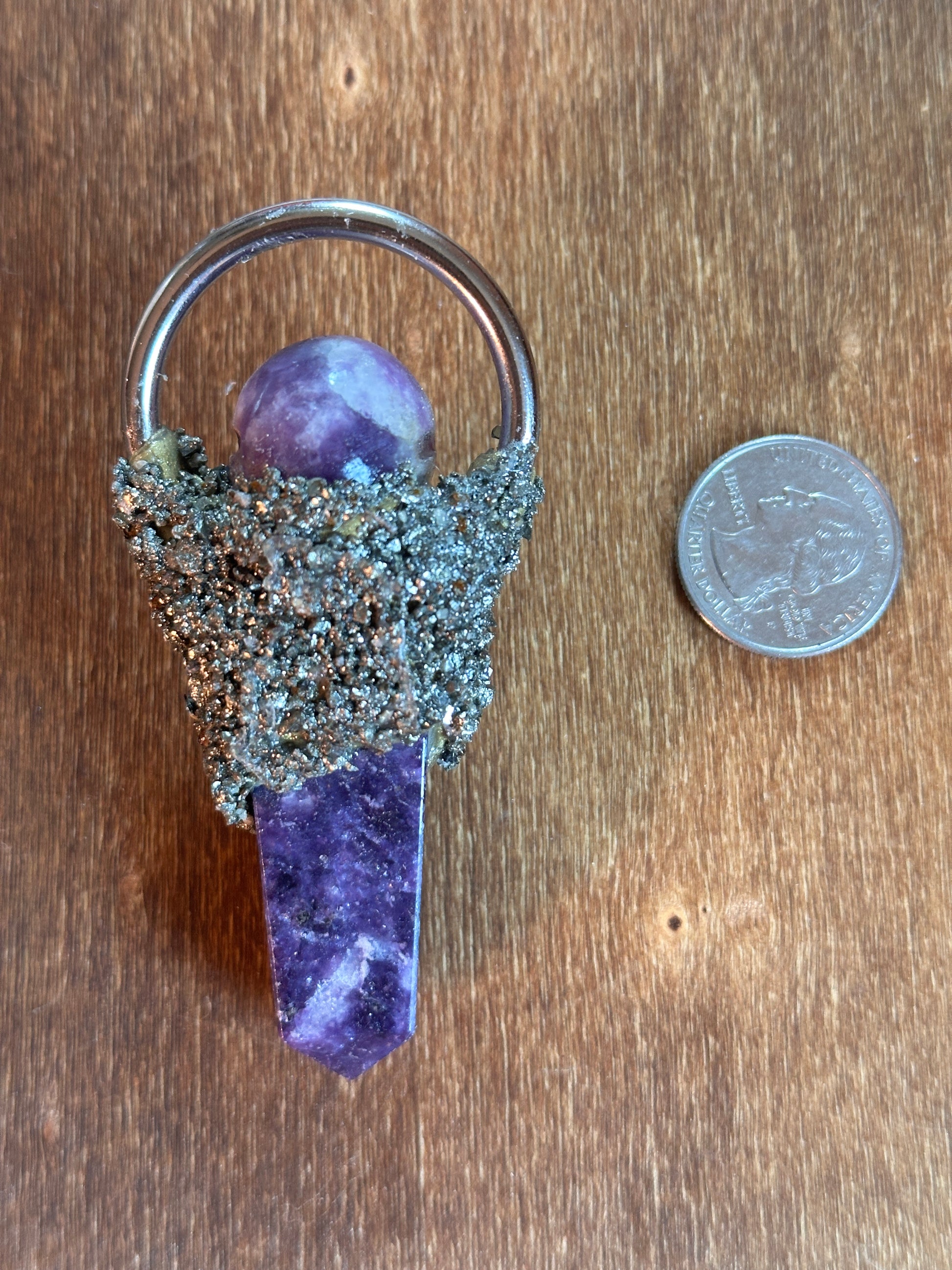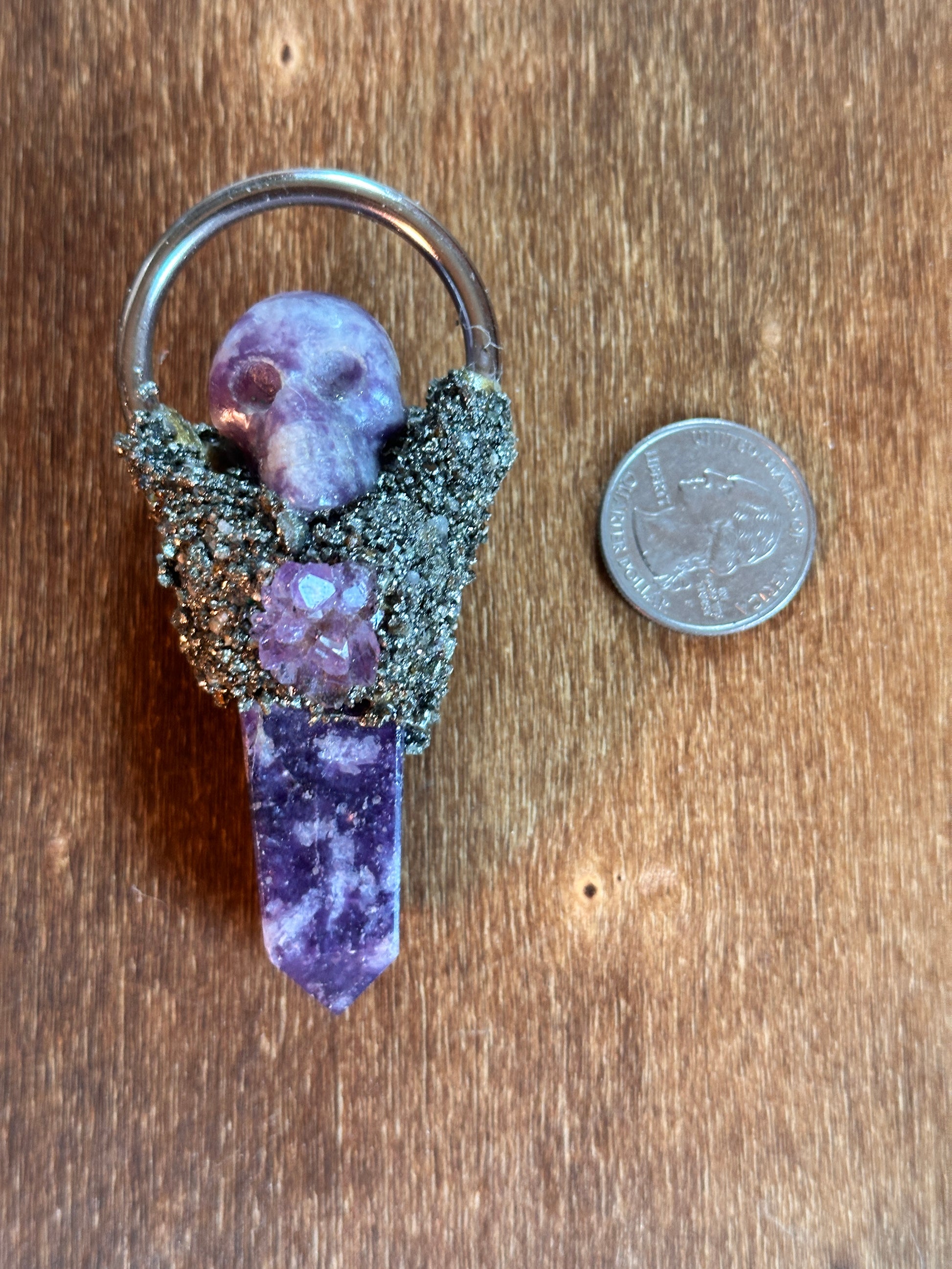 Wisteria Whispers features a stunning Lepidolite skull and crystal, accented with natural pyrite and amethyst. This unique piece not only adds a touch of glamour to any outfit, but also promotes feelings of calmness and balance. Elevate your style and your well-being with Wisteria Whispers.